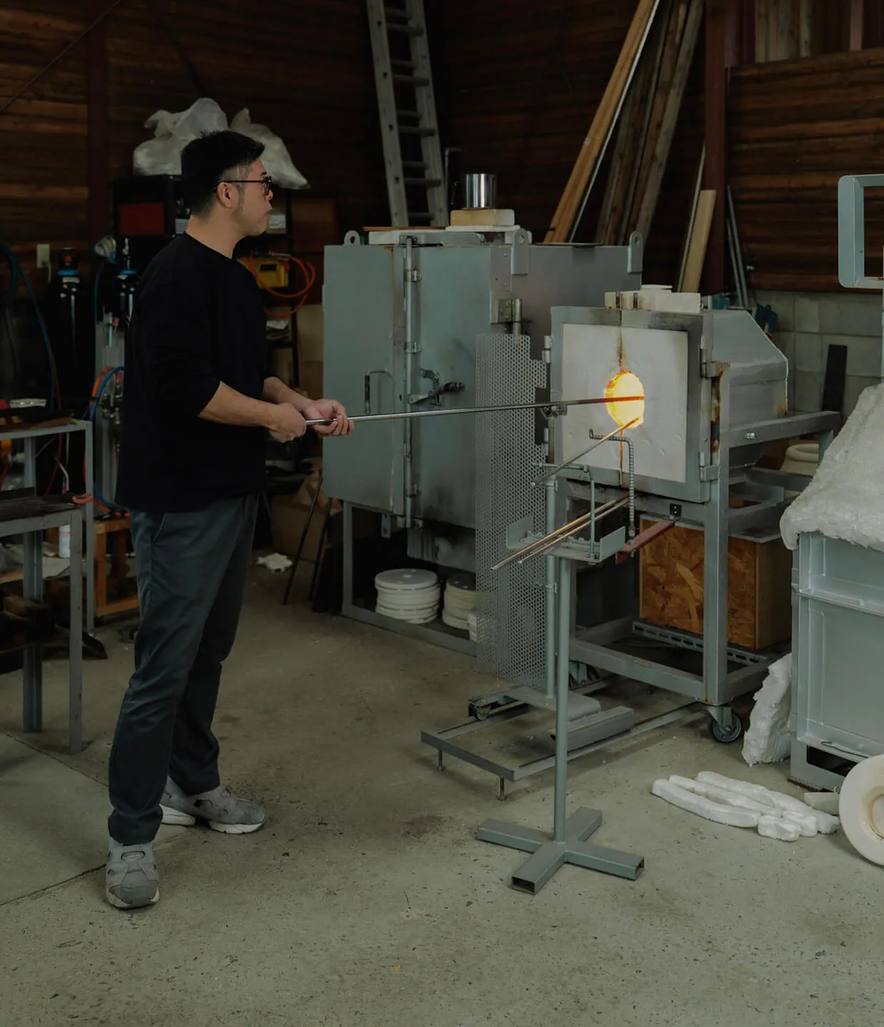 ガラス作家の感性で色付け、ガラスを吹き、形成していきます。