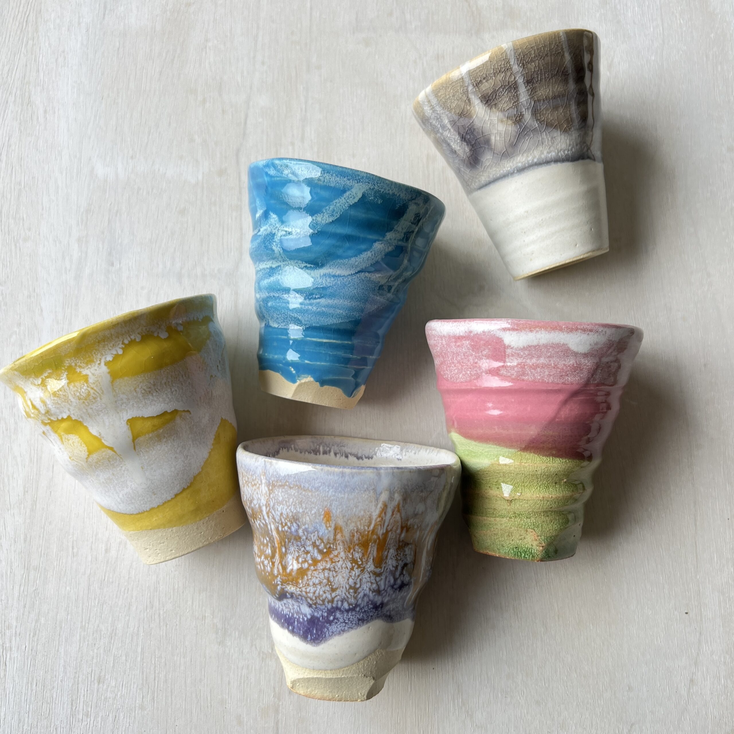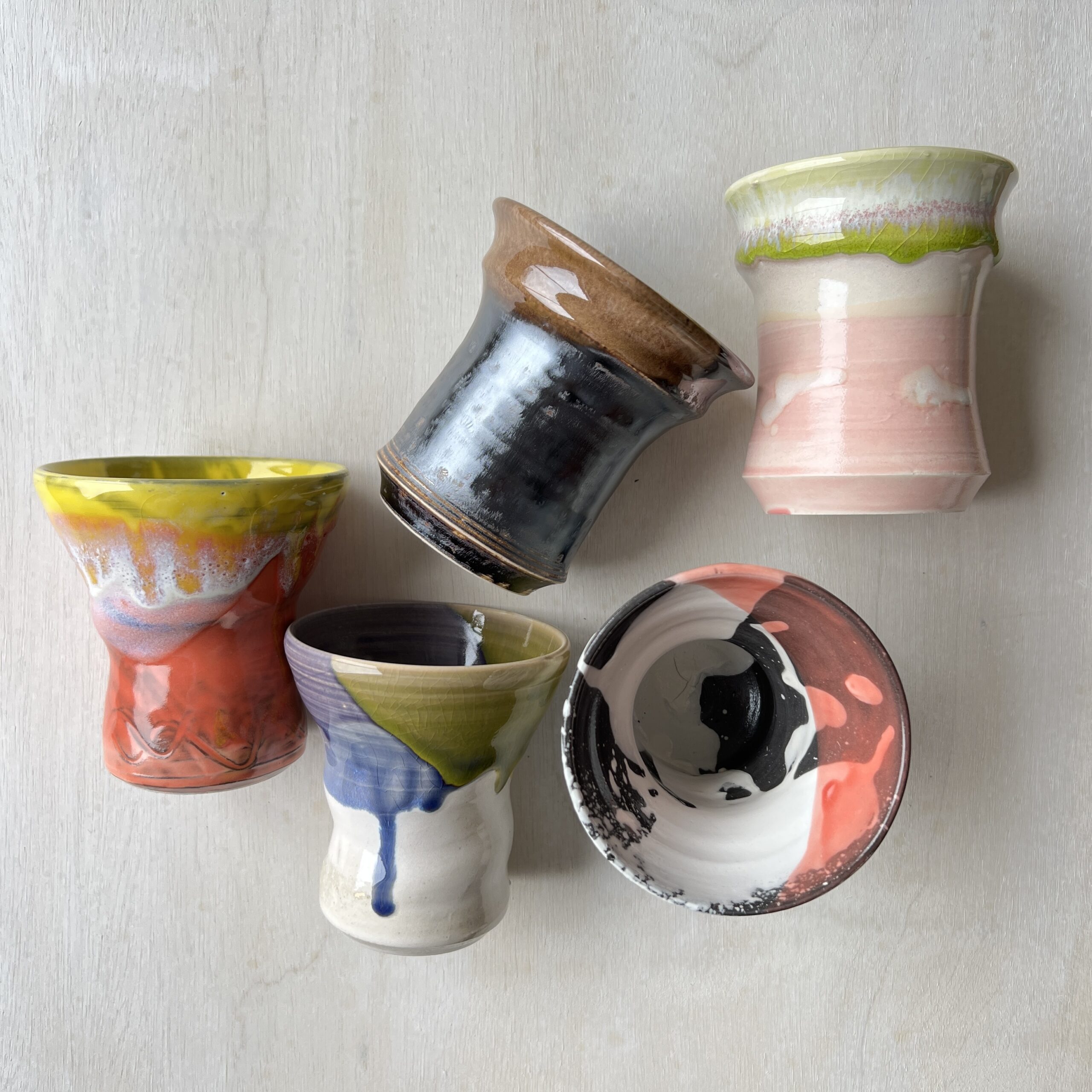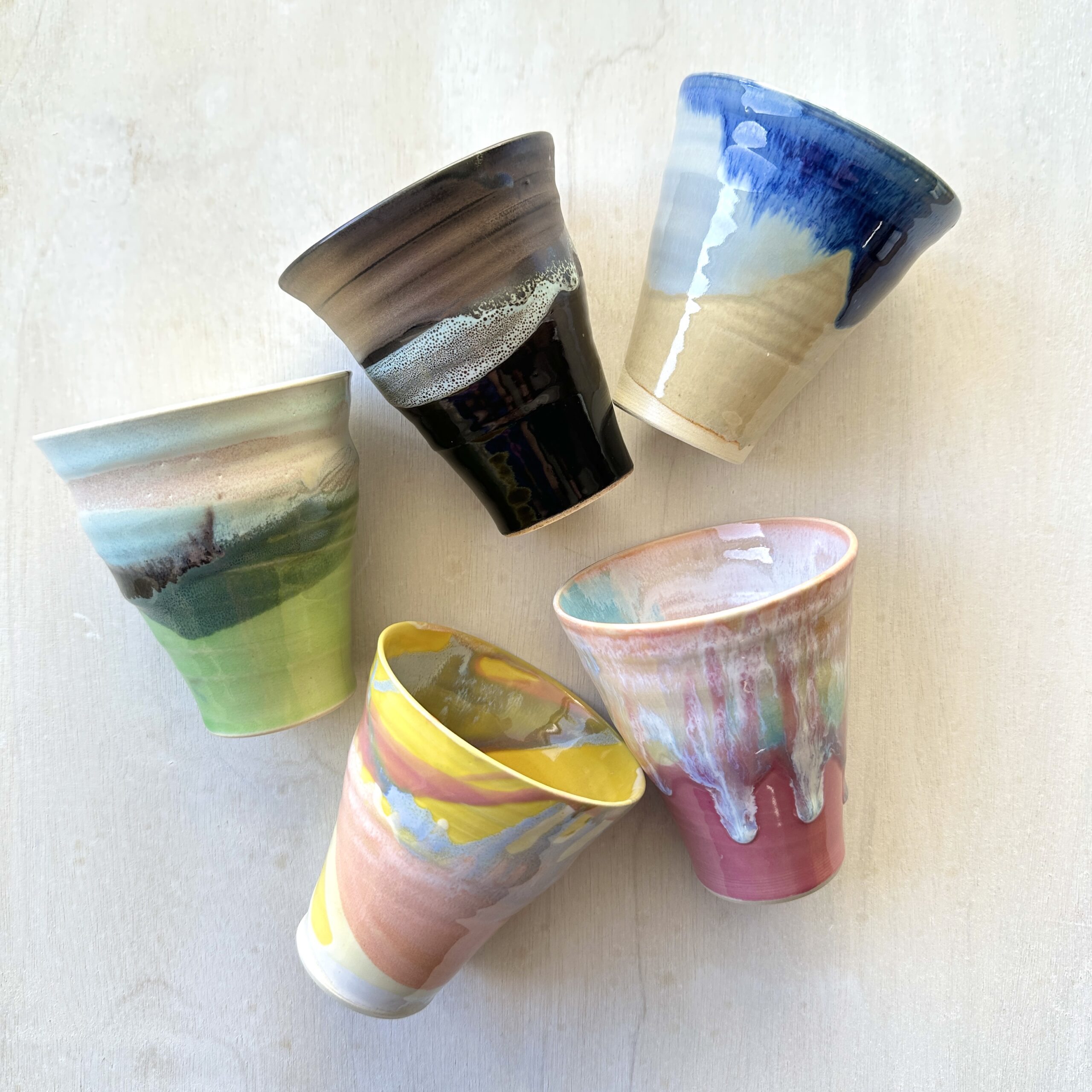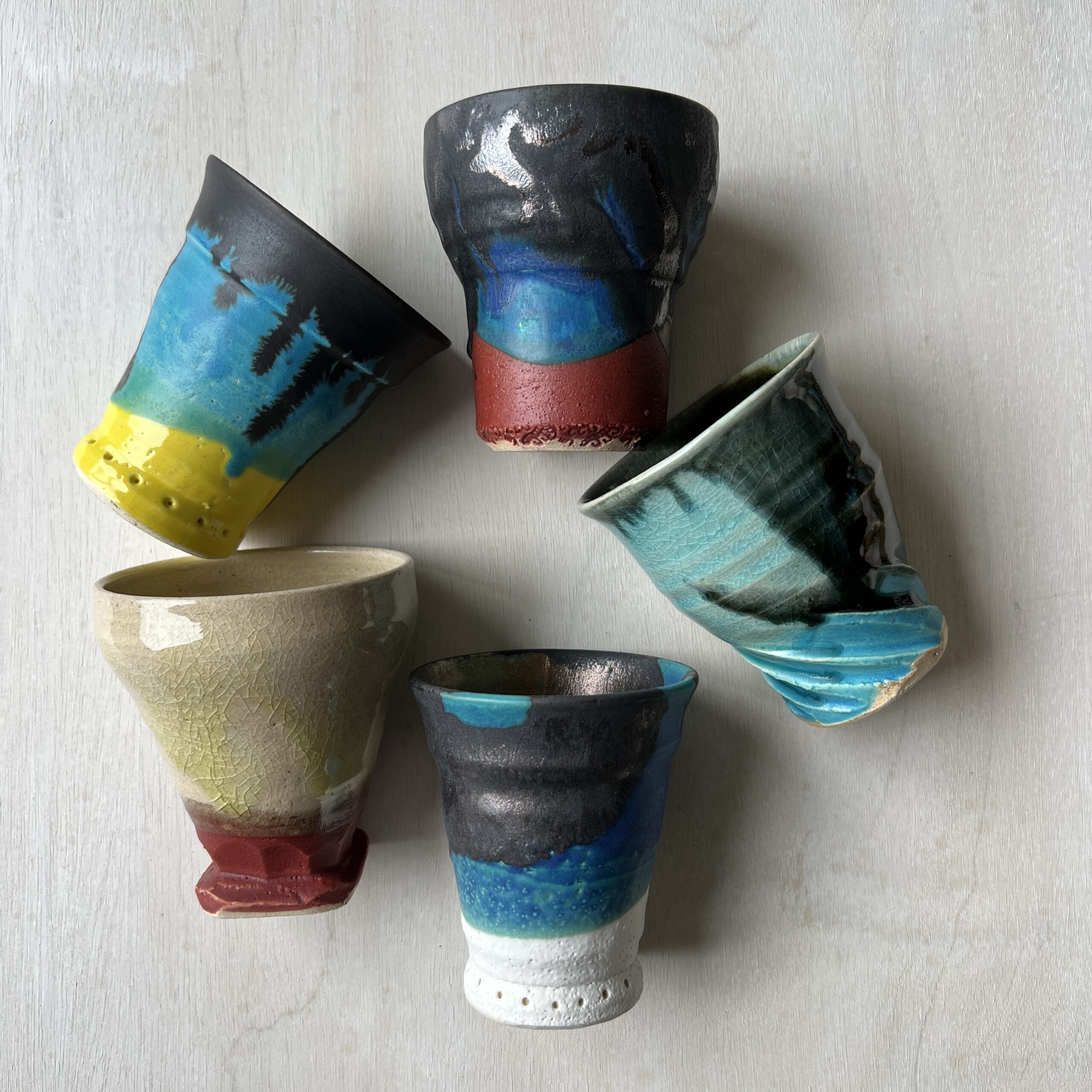 吹きガラスの中でも宙吹きという技法を用いてグラスを制作しています。宙吹きらしい柔らかなシルエットと色ガラスを多用し、カラフルでポップな雰囲気のグラスが少しでも日常を彩る器になる様願いを込めて制作しています。