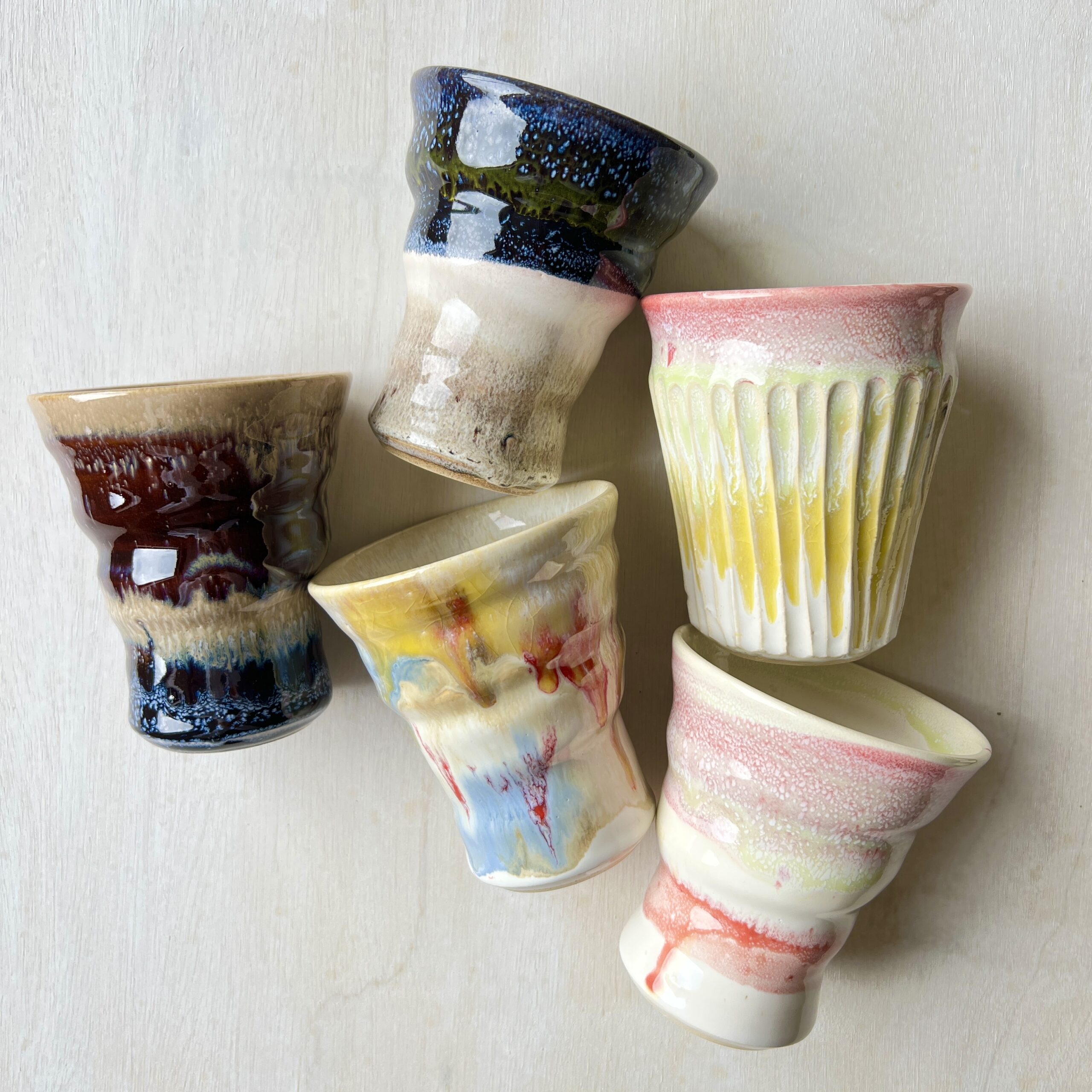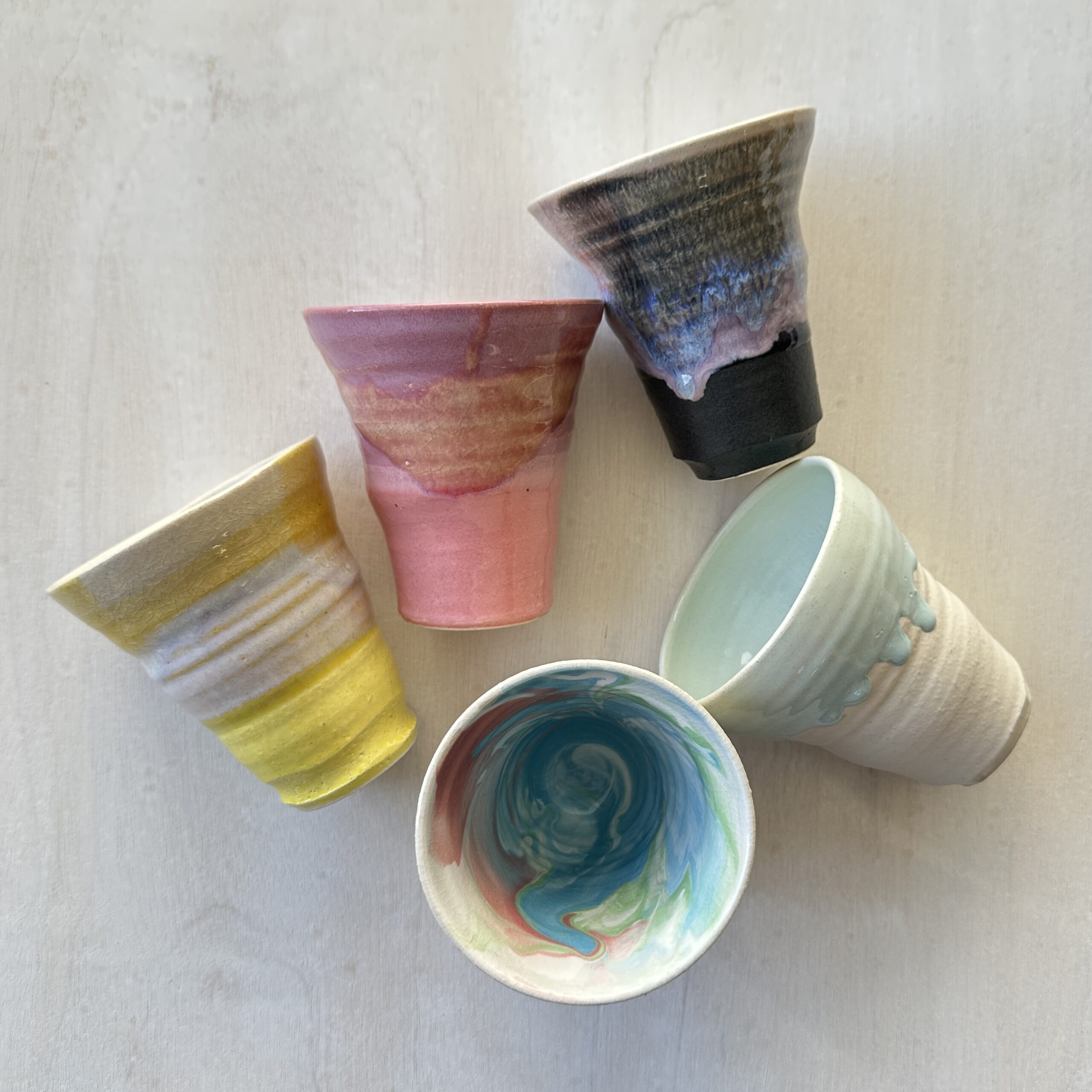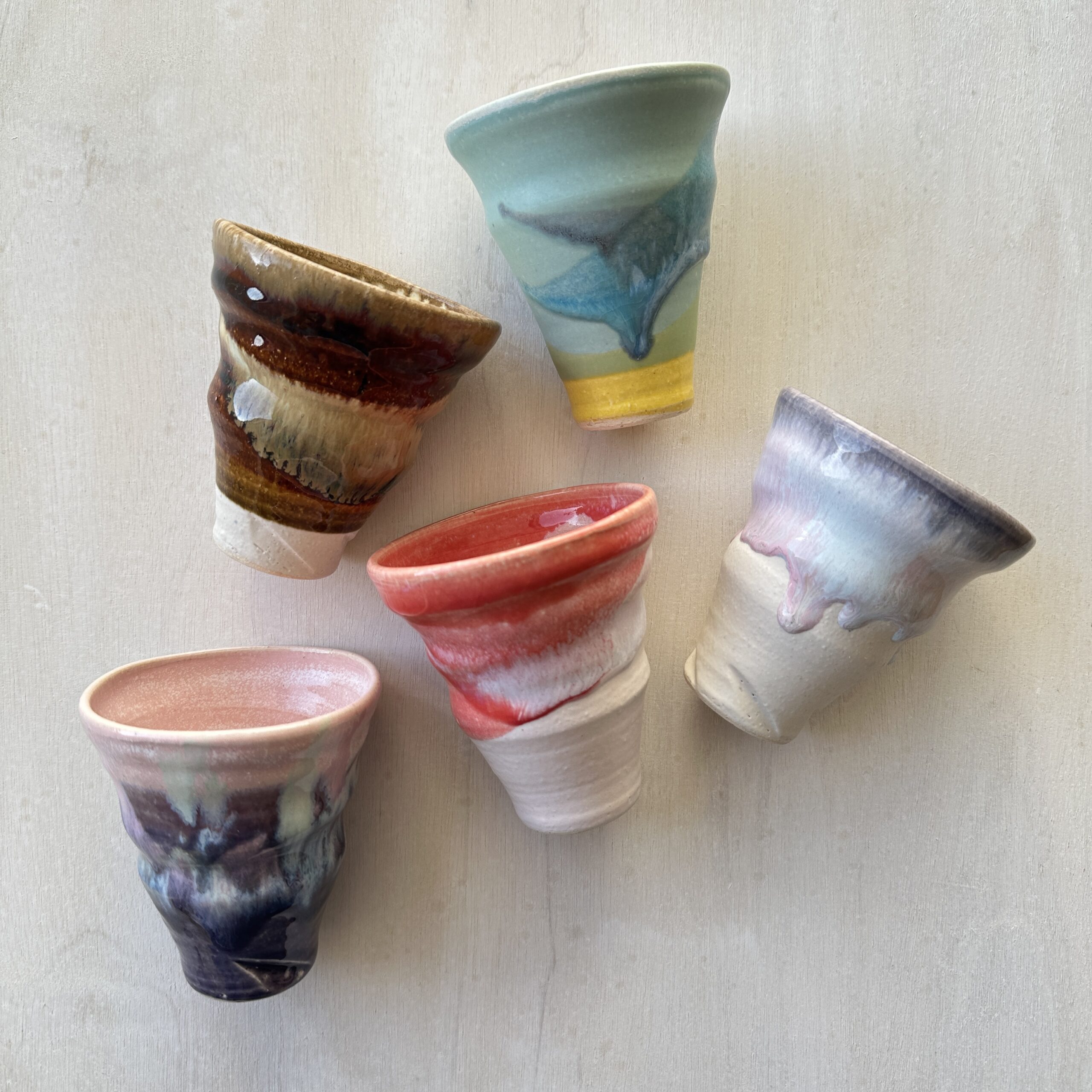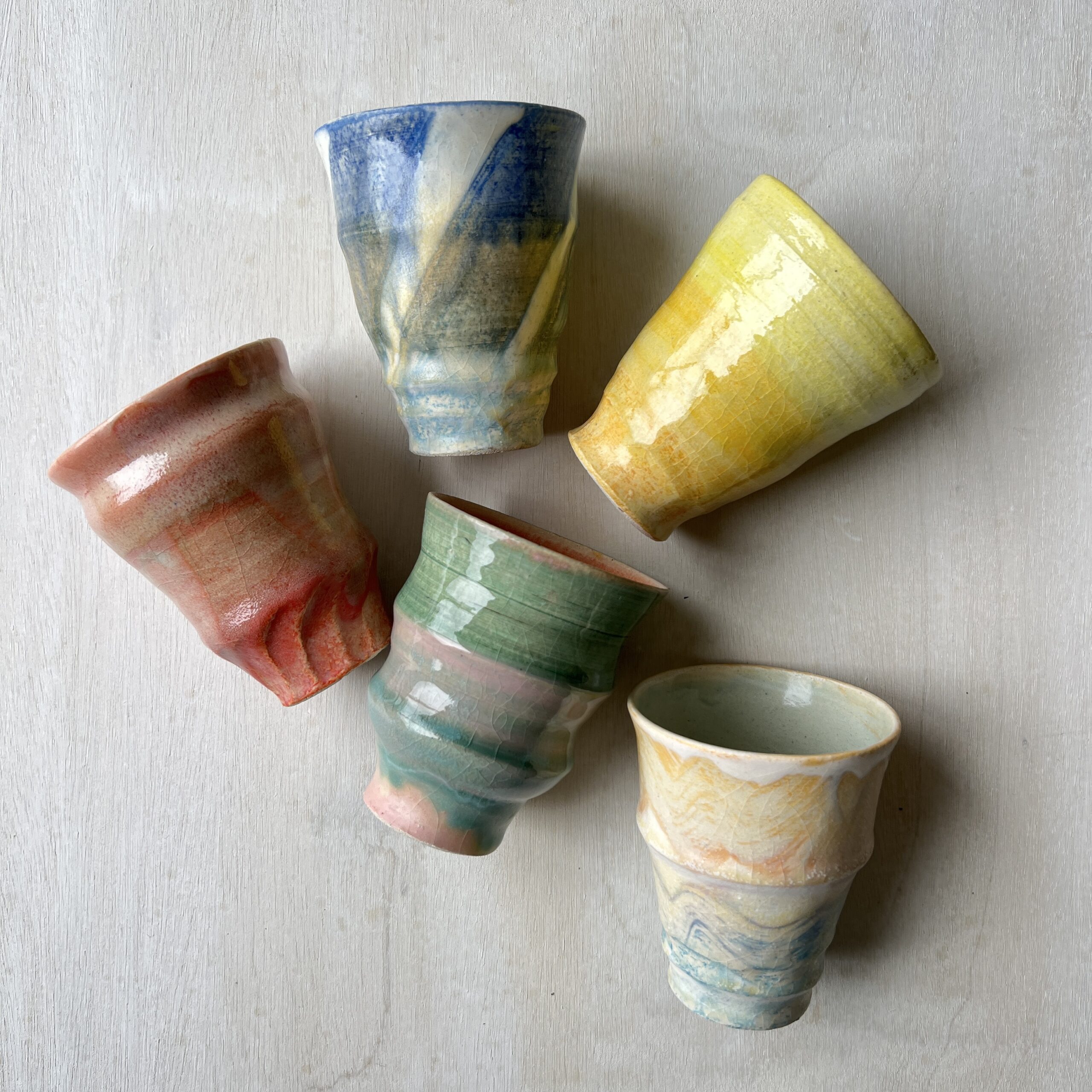 吹きガラスの中でも宙吹きという技法を用いてグラスを制作しています。宙吹きらしい柔らかなシルエットと色ガラスを多用し、カラフルでポップな雰囲気のグラスが少しでも日常を彩る器になる様願いを込めて制作しています。