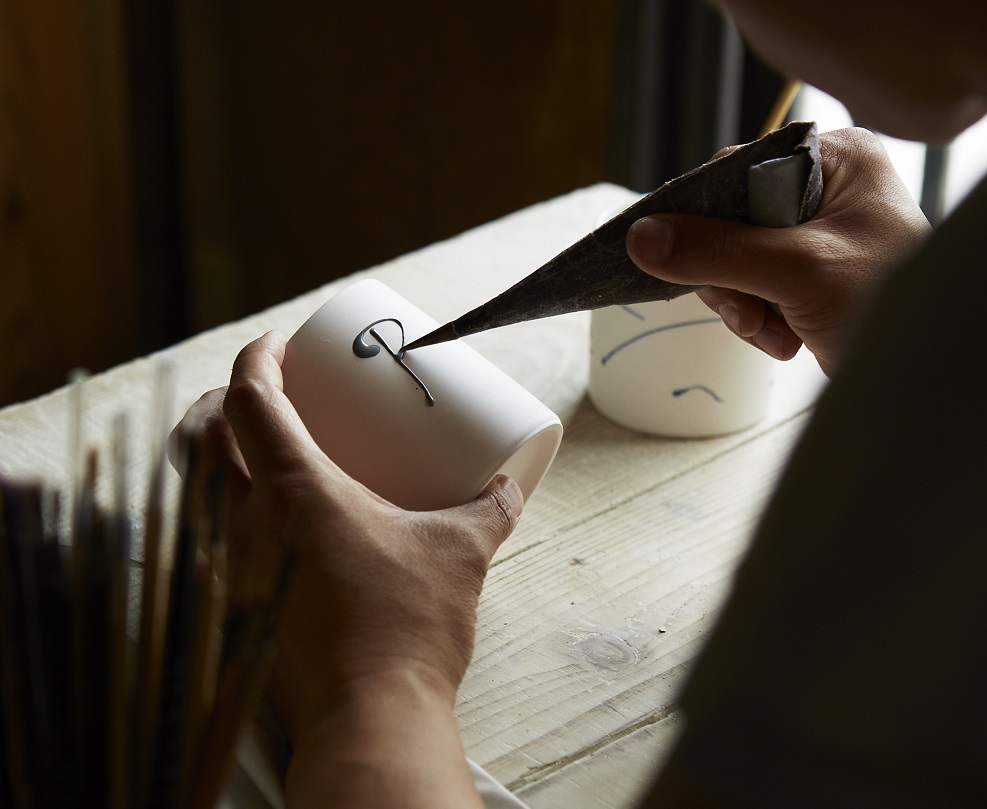 京焼の伝統技法の一つ いっちんの技術を用いて柔らかくぷっくり盛り上がった可愛い文字を一つずつ丁寧に描くことを心がけています。