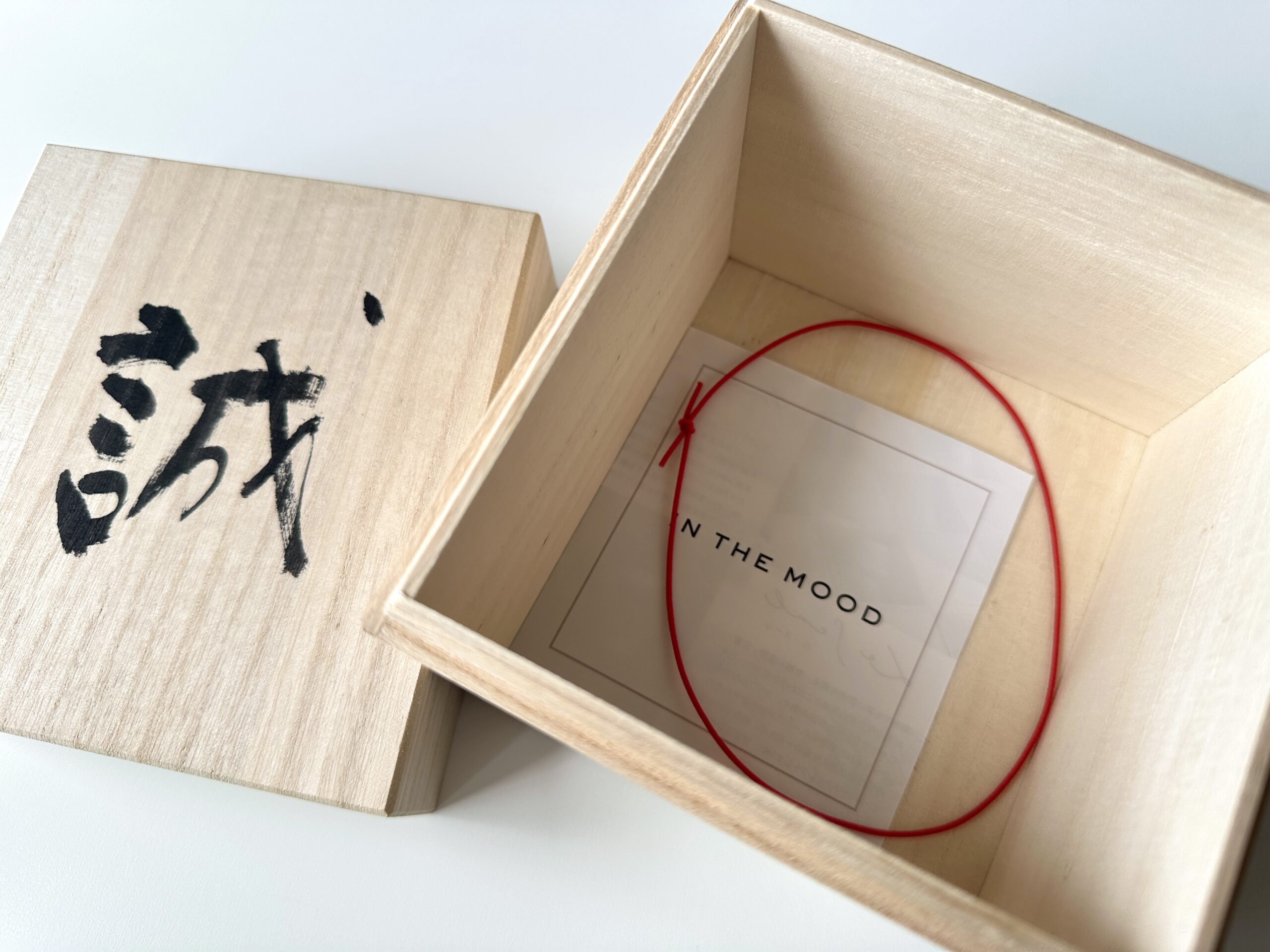 この赤い紐ゴムは木箱を開けた後、お持ち帰りいただく際にご使用いただくために