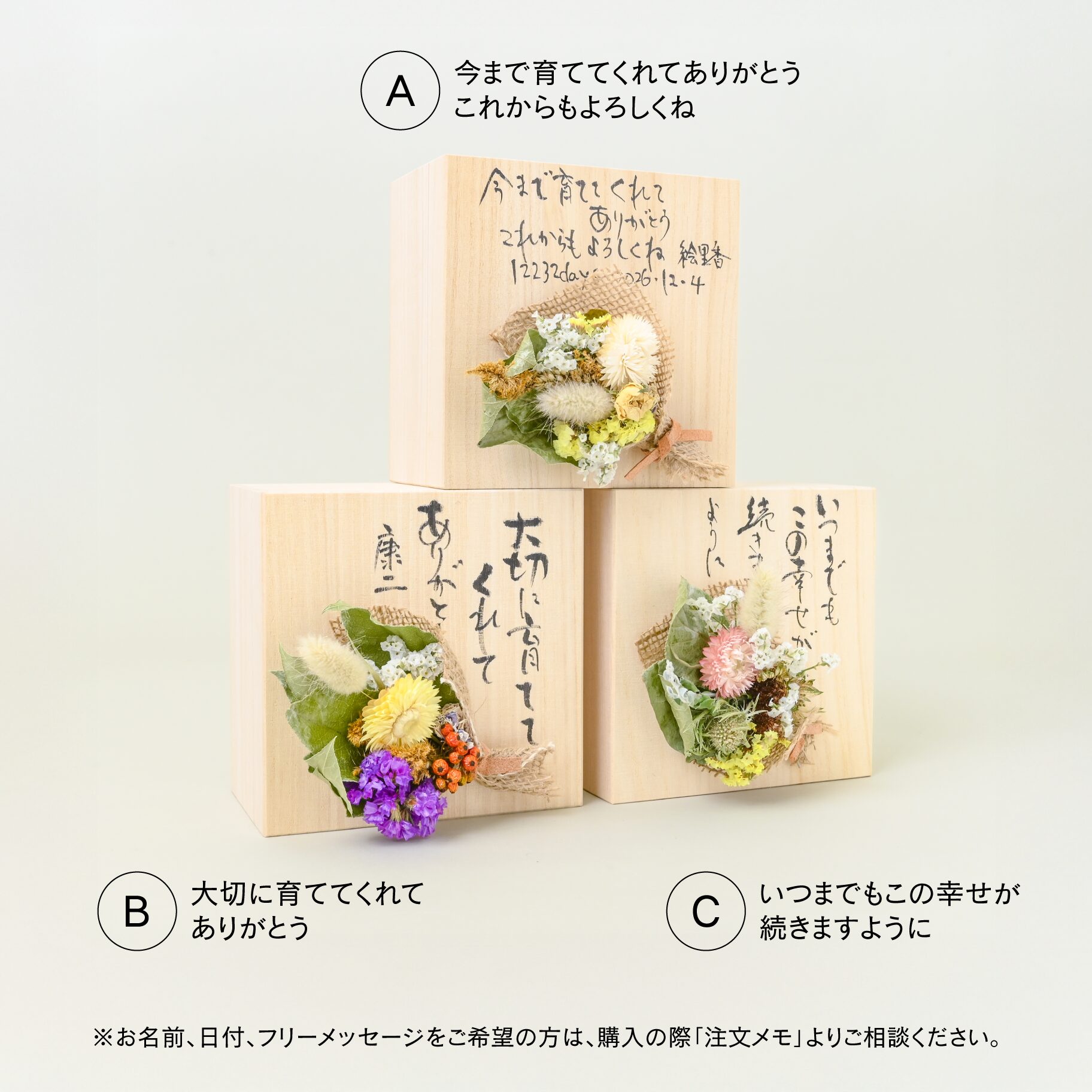 専用の木箱には新郎様もしくは新婦様のお名前と、お誕生日から結婚式当日までの日数をお書きし、子育て感謝状としてお渡しいただけます。文字はすべてカリグラファーが手書きで仕上げ、温もりと想いが伝わる仕立てです。さらに、ドライフラワーのミニブーケを添えて華やかさをプラスします。ブーケの内容はおまかせになります。