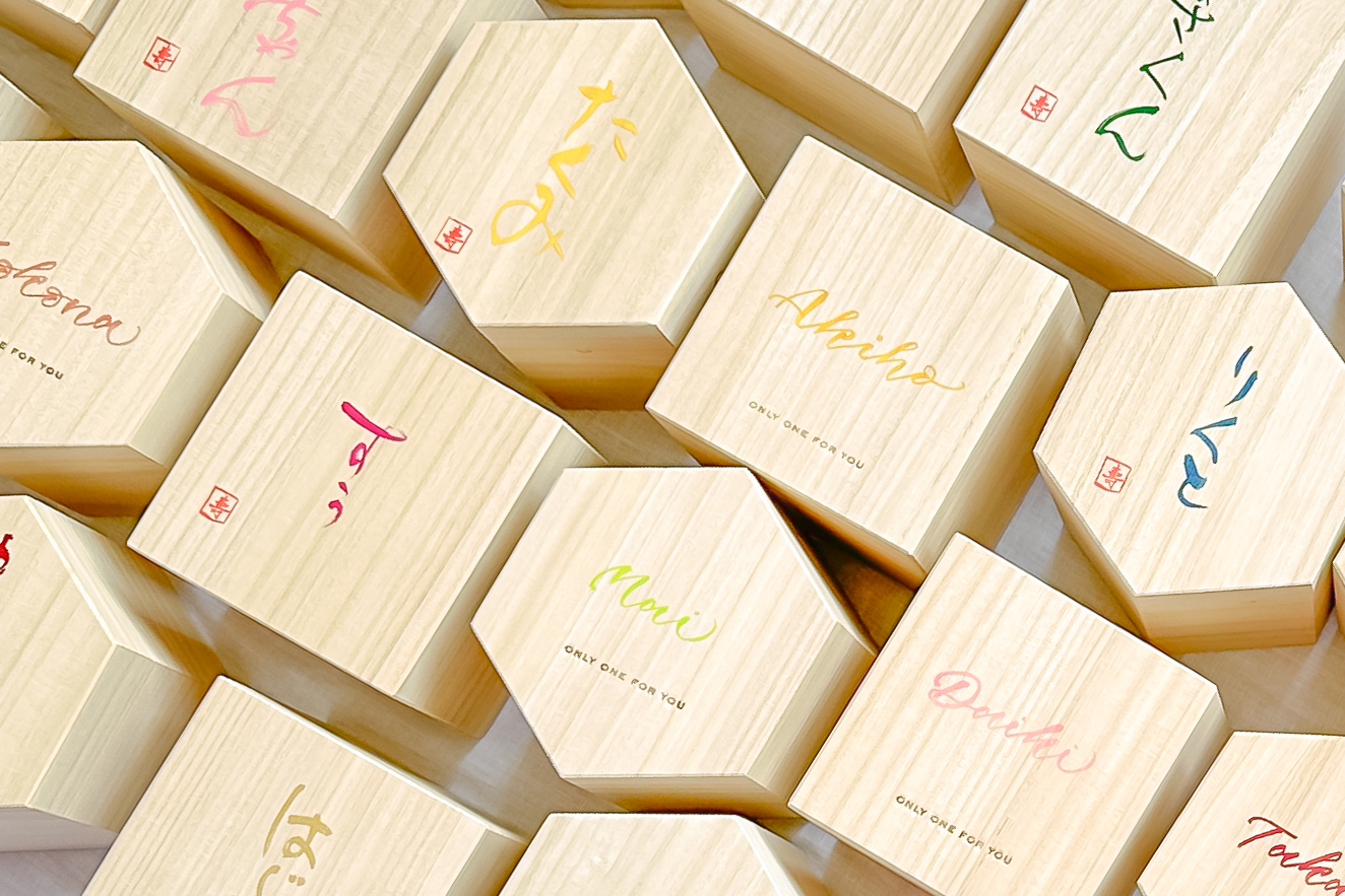 木箱にはお名前やあだ名をモダンカリグラフィー、または書でお書きいたします。