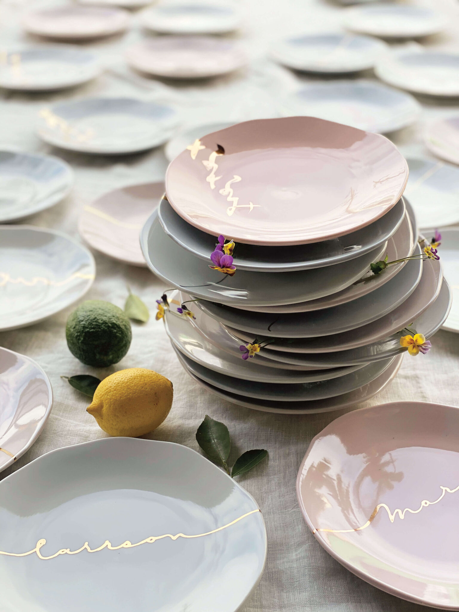 プレートに描かれるお名前は、アルファベットの場合はカリグラファーが、ひらがなの場合は書家が一文字ずつ丁寧に筆を入れます。どちらも24K(本金)を使用した釉薬で仕上げ、上品な輝きと温もりを感じさせる特別な一枚です。