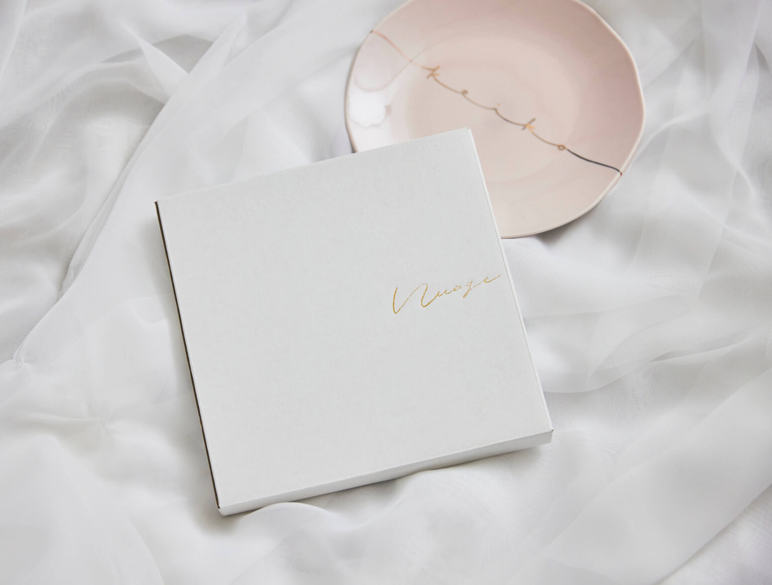 プレートの形はあえて少しいびつにすることで、手仕事ならではの表情を演出。淡いカラーリングはどんなテーブルコーディネートにもなじみ、和洋どちらの雰囲気にも合わせやすいデザインです。専用の紙箱には、Nuageのロゴを金の箔押しであしらい、高級感のある仕上がりに。