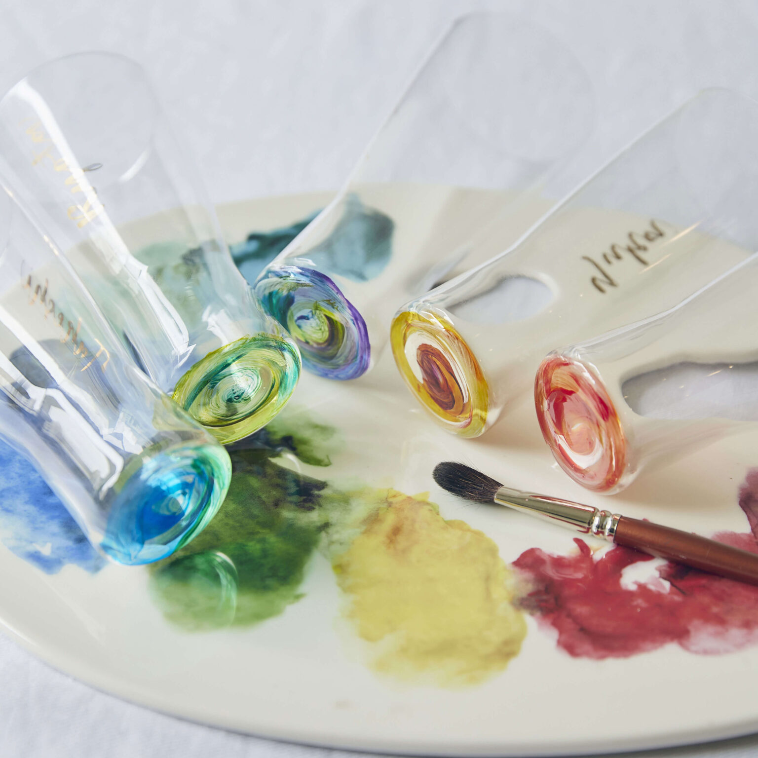 グラスの底面は万華鏡のような模様。フランス製の絵付け絵具を使い、ゲスト一人ひとりのイメージに合わせ、クリエイターが唯一無二のカラーを調合します。