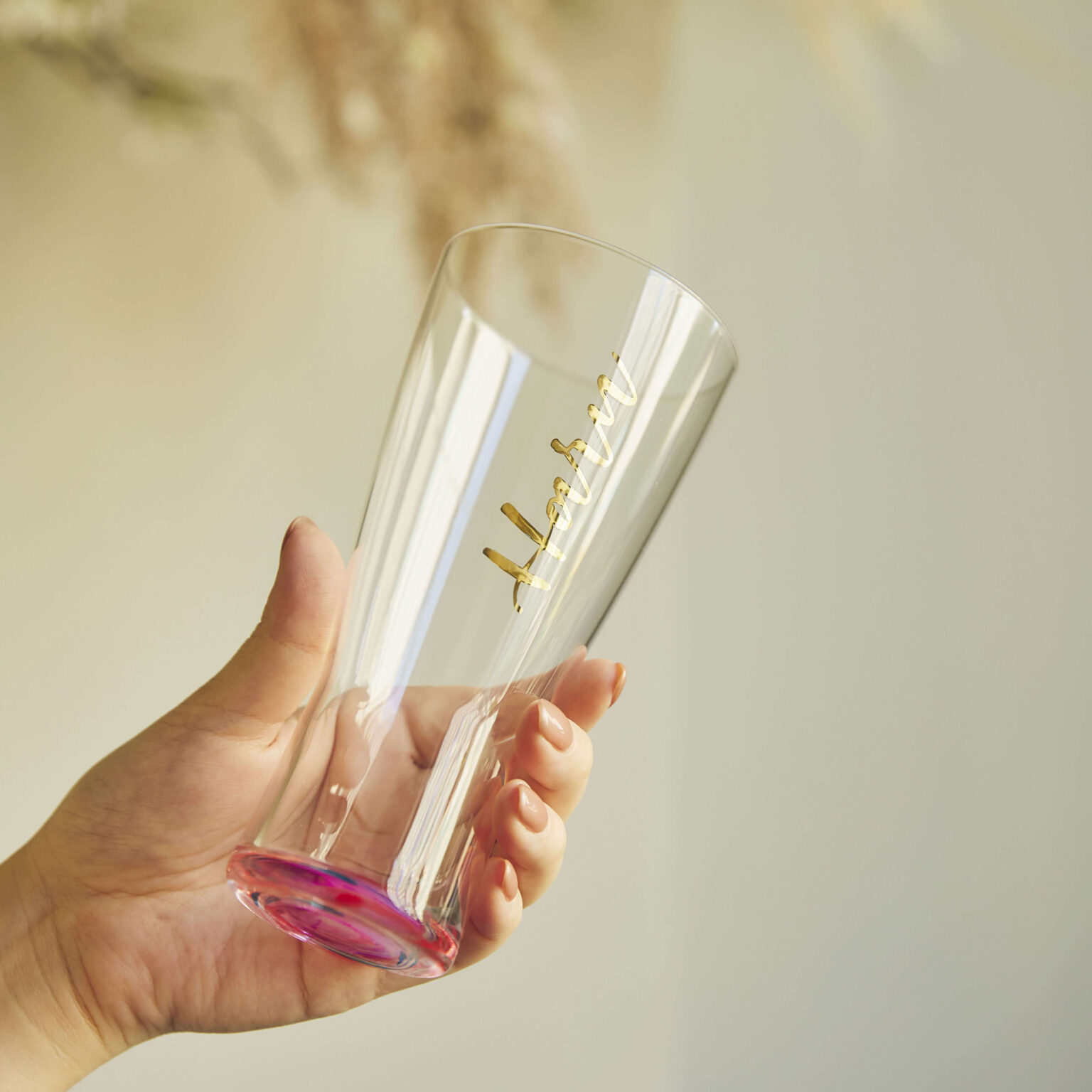グラスは細身で持ちやすく、女性の手にもすっとなじむデザイン。350mlの缶ビールがぴったり入るサイズ感で、お酒だけでなくお茶やジュースなどにも毎日お使いいただけるアイテムです。