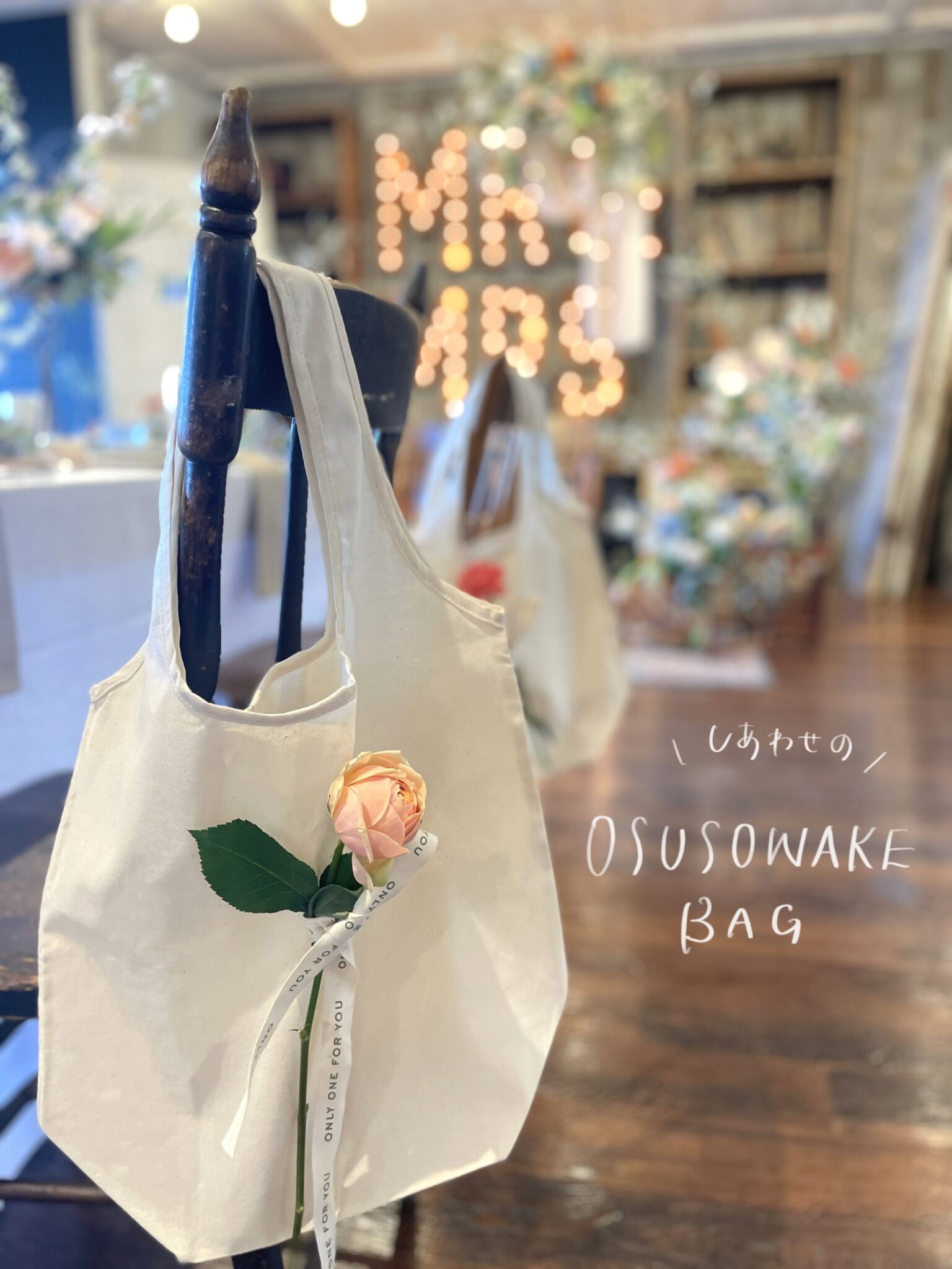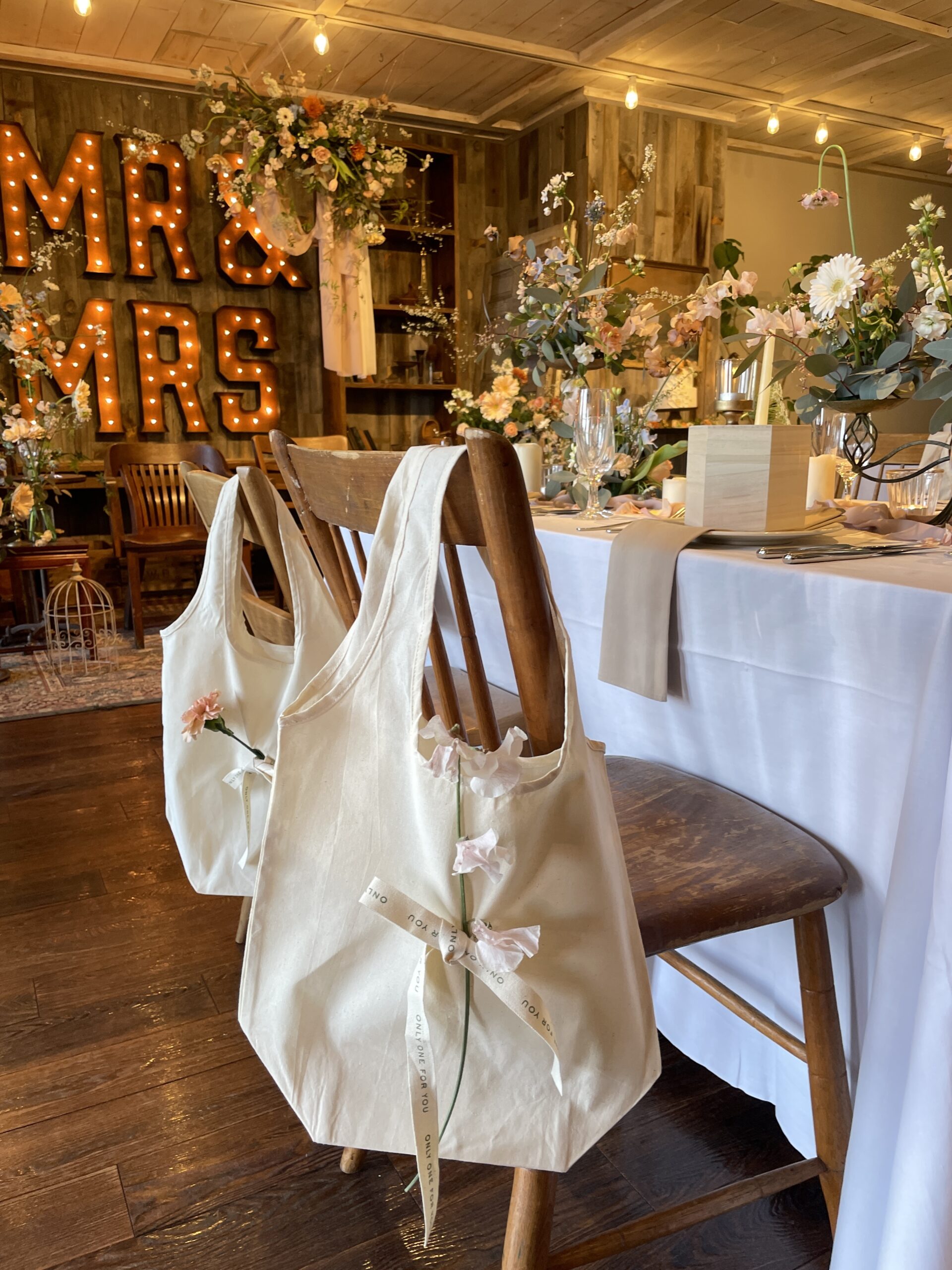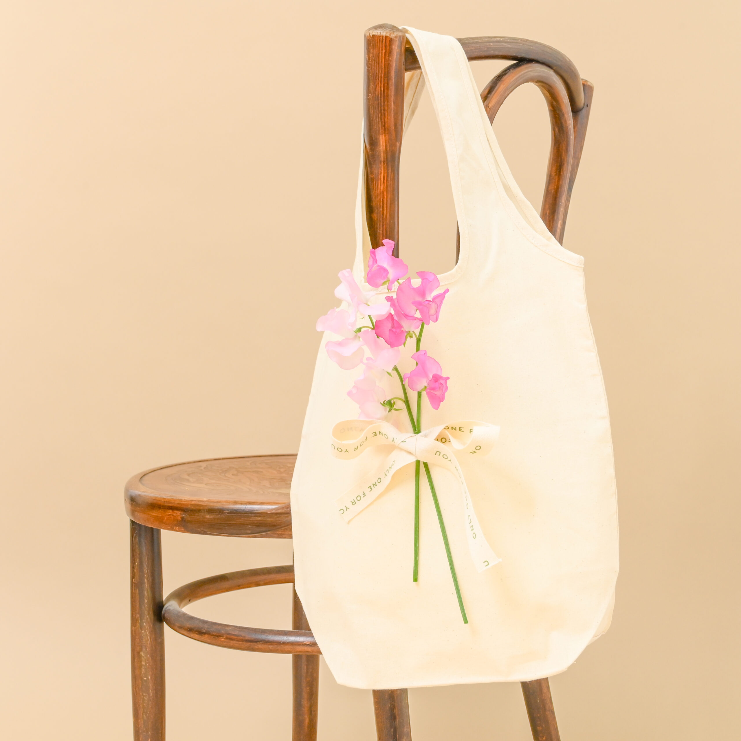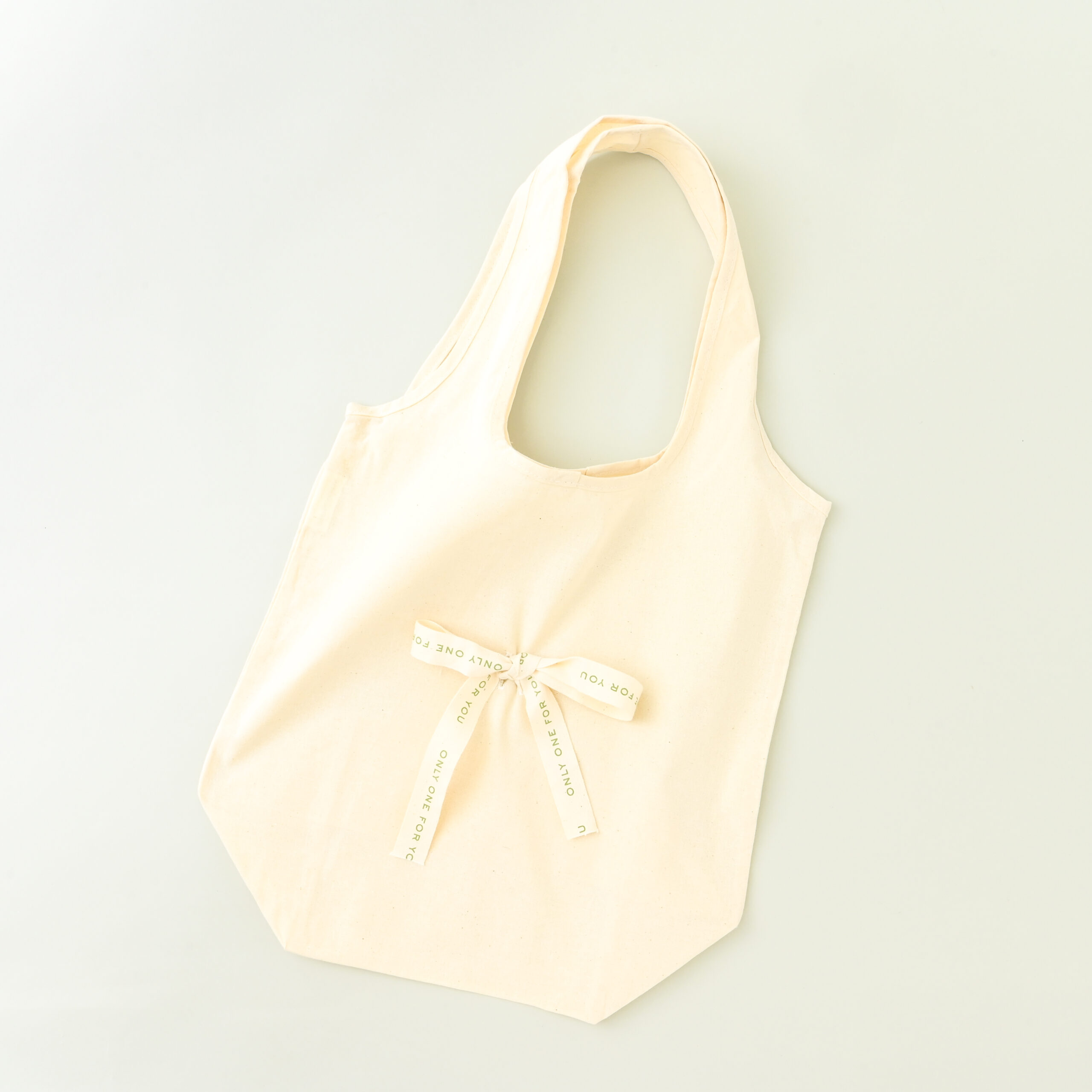 フロントにはリボンをあしらい、お花を結んで「幸せのおすそわけ」としてお持ち帰りいただける仕様に。お式後はエコバッグとしてもご使用いただけます。サイズにもゆとりをもたせているため、プラスワンギフトを入れても安心です。