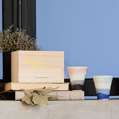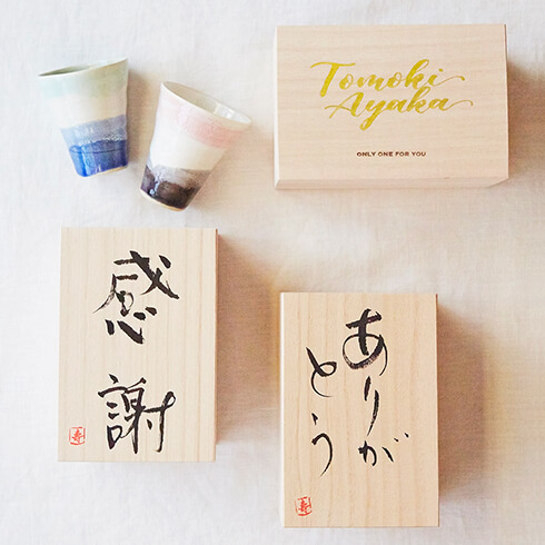 このペアカップでは、木箱に長めのメッセージを入れることができるのも嬉しいポイント。お二人のお名前はもちろん、「ありがとうございます」「おせわになりました」といった感謝の言葉や心に残るフレーズを添えれば、世界に一つだけの特別な贈り物になります。