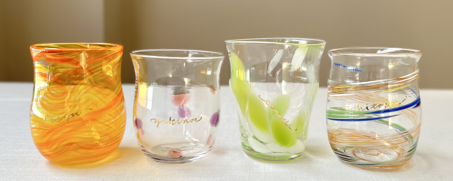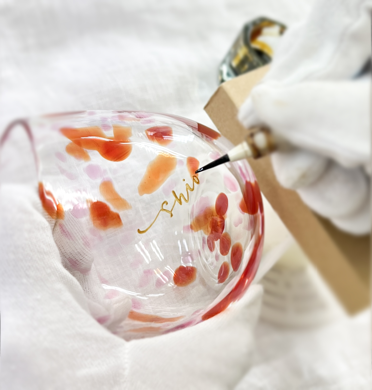 木箱に加え、ガラスカップの色や形、模様に合わせて、金文字でお好きな文字をお書きします。
