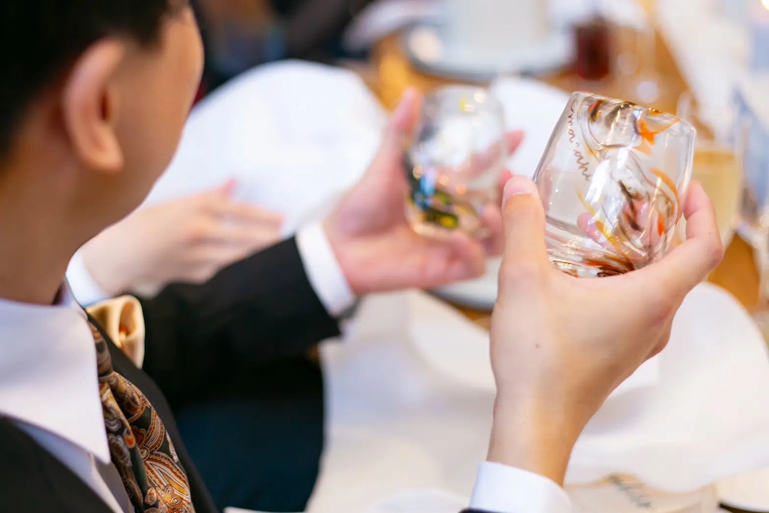 披露宴では、MCの合図で一斉に木箱を開ける「オープンセレモニー」も人気。器を見せ合えば会話も弾み、入場前の待ち時間さえ楽しいひとときに変わります。20個以上のご注文で限定の当たり「ゴールドリング(あたりカップ)」をお付けでき、当たったゲストへスピーチをお願いするなどのサプライズ演出も可能です。