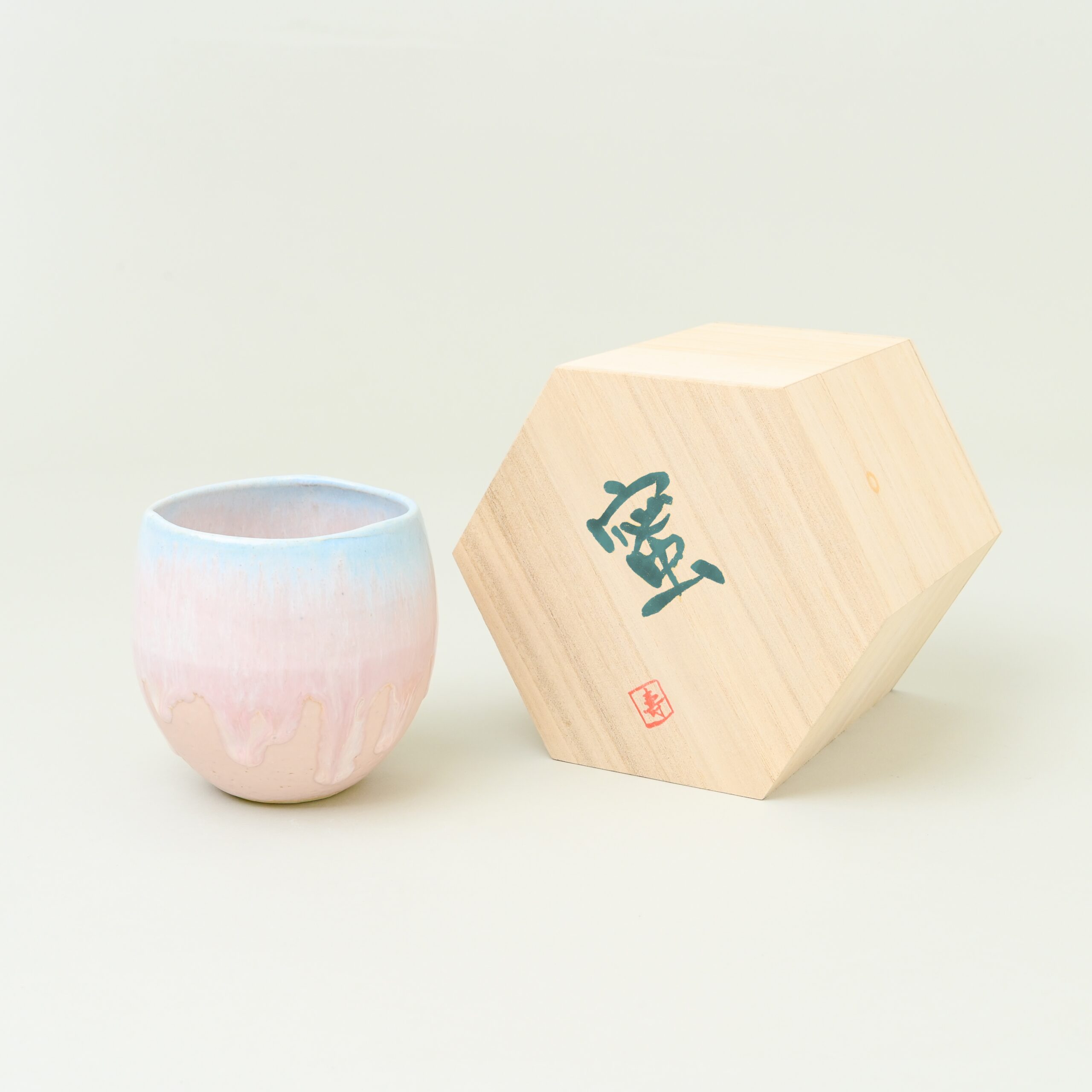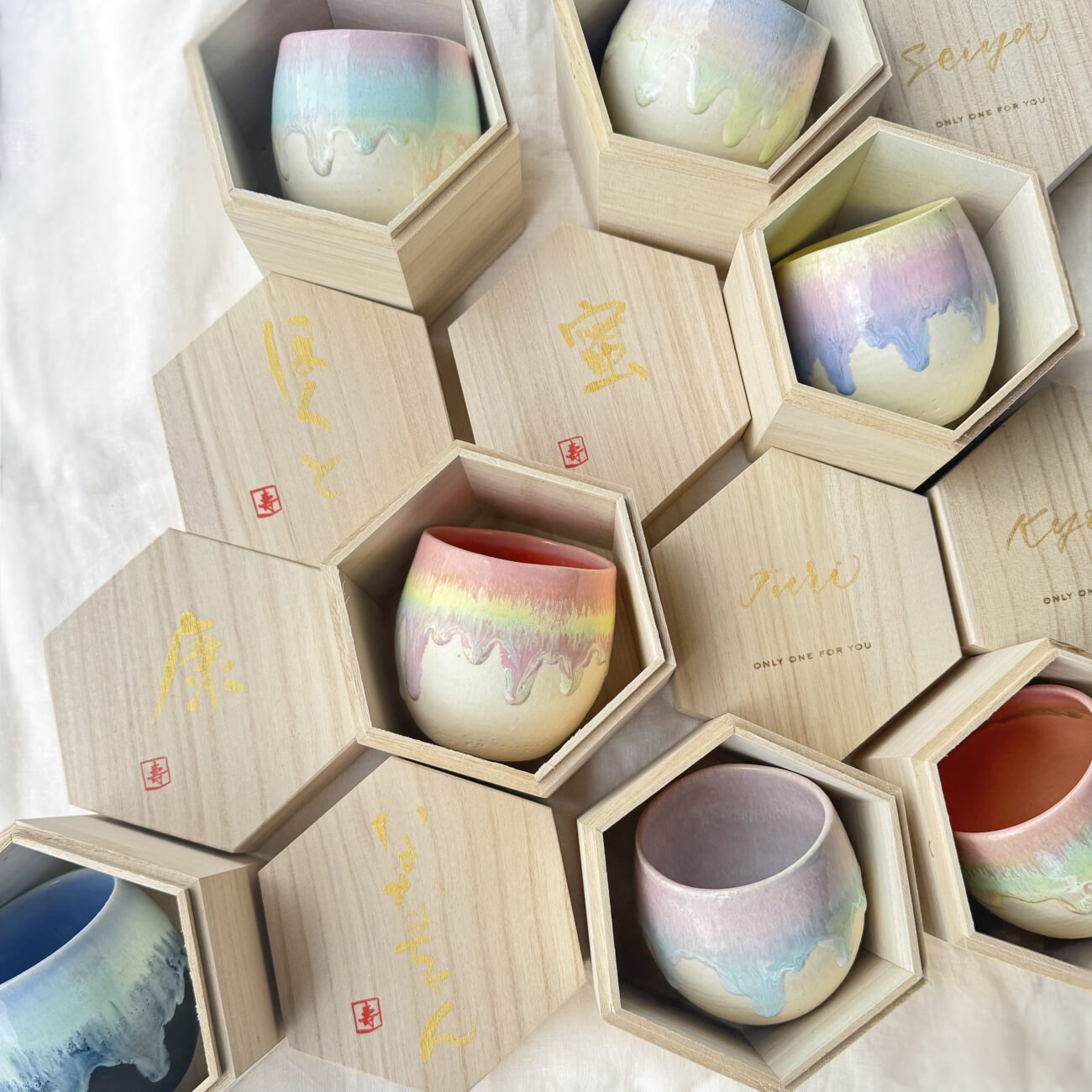 ぽってりと流れるような釉薬と、マットな質感のベースに艶を重ねた独特の風合いは、熟練の陶芸家の技術と配合によって実現しました。全て一点もののため、色や表情は一つとして同じものはありません。木箱を開ける瞬間まで、どんなカップが入っているかはお楽しみ。サプライズ感も贈り物の魅力の一つです
