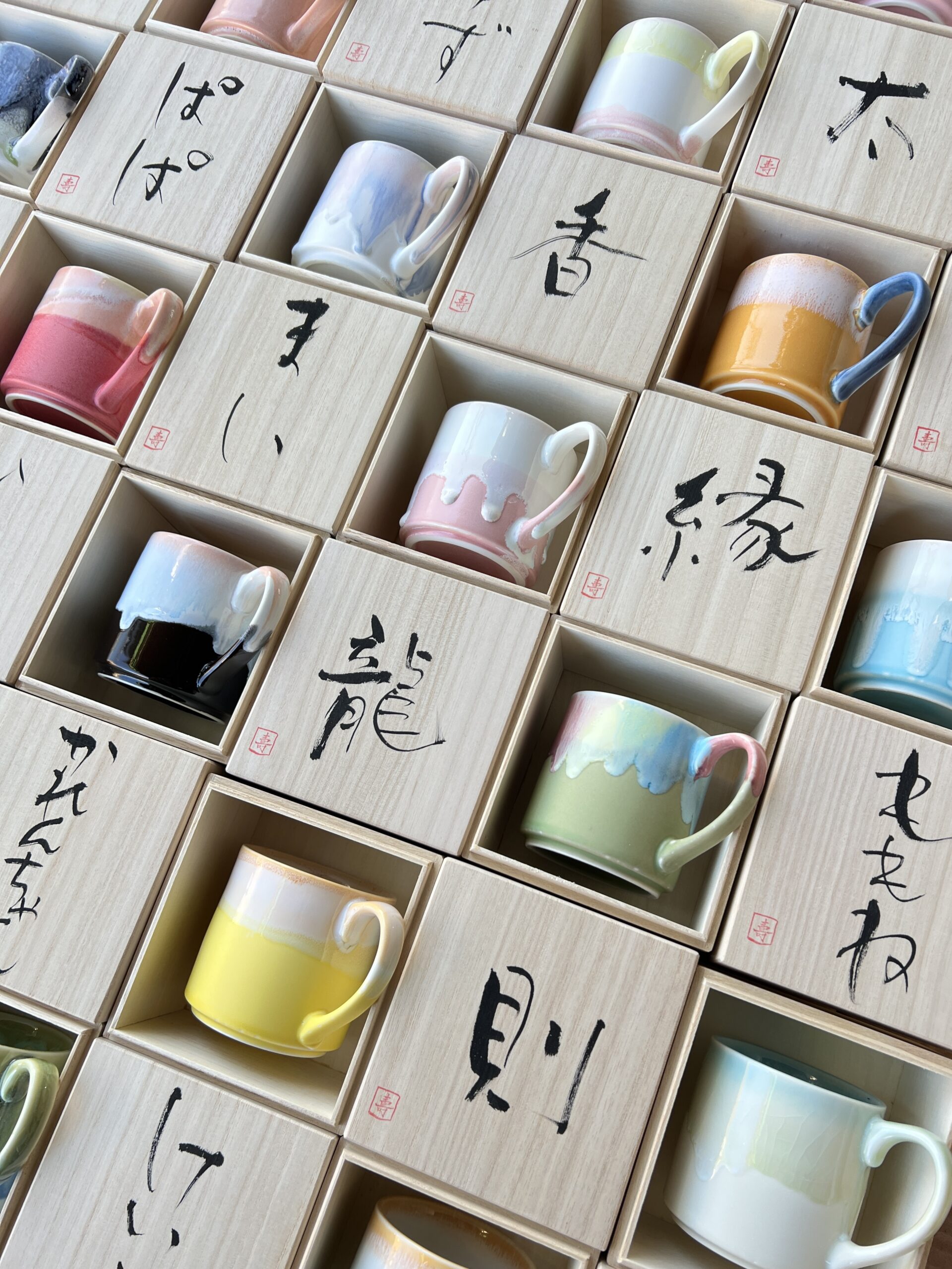 取っ手付きで日常使いしやすいデザインは、世代を問わず愛されるかたち。カラフルで一点ごとに表情が異なるのも魅力です。全てが一点ものであり、お名前のイメージからインスピレーションを受けたデザインを専任のカップセレクターが心を込めて一つずつお選びします。